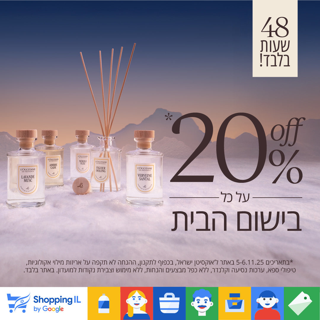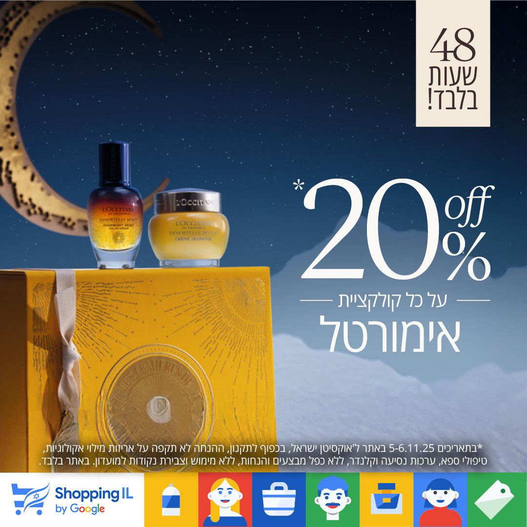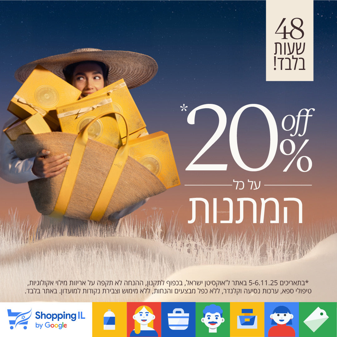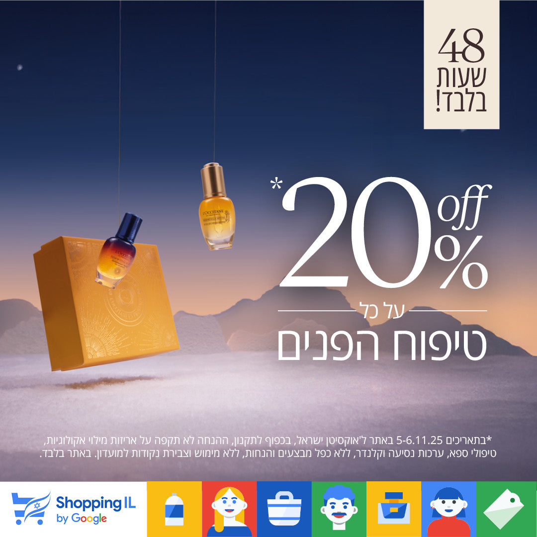 *בתאריכים 5-6.11.25 באתר ל'אוקסיטן ישראל, בכפוף לתקנון, ההנחה לא תקפה על אריזות מילוי אקולוגיות, טיפולי ספא, ערכות נסיעה וקלנדר, ללא כפל מבצעים והנחות, ללא מימוש וצבירת נקודות למועדון