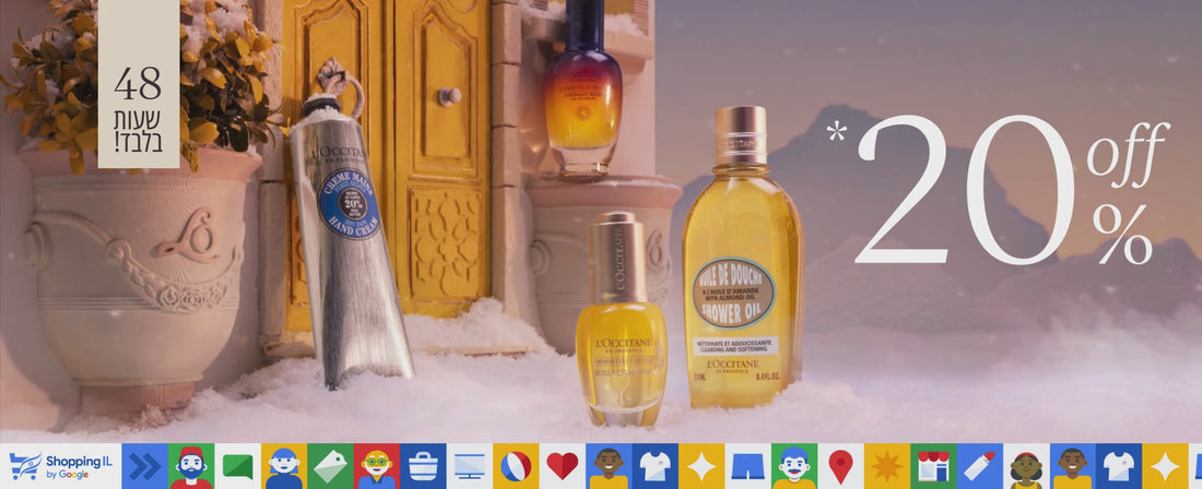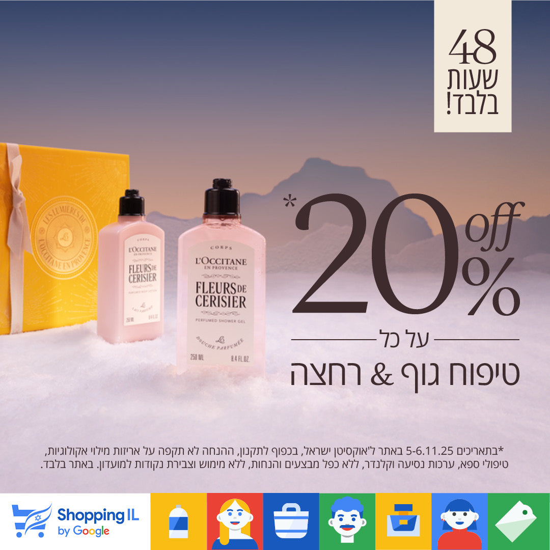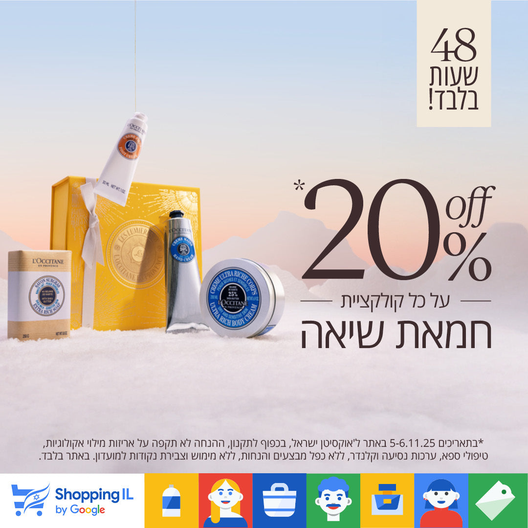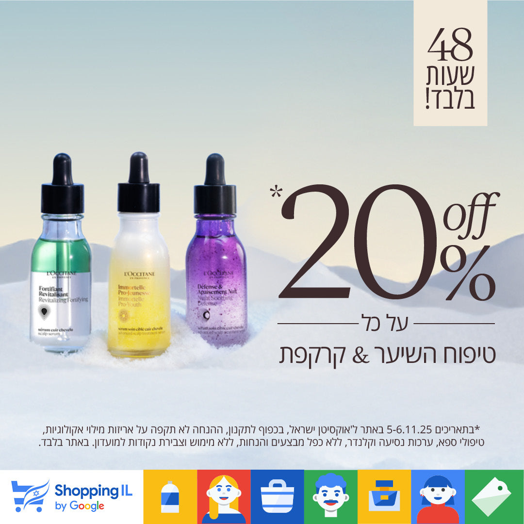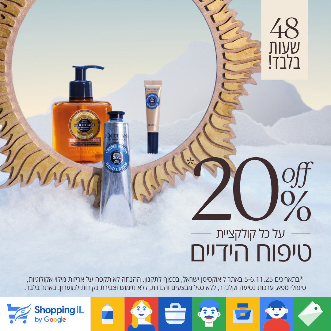 *בתאריכים 5-6.11.25 באתר ל'אוקסיטן ישראל, בכפוף לתקנון, ההנחה לא תקפה על אריזות מילוי אקולוגיות, טיפולי ספא, ערכות נסיעה וקלנדר, ללא כפל מבצעים והנחות, ללא מימוש וצבירת נקודות למועדון