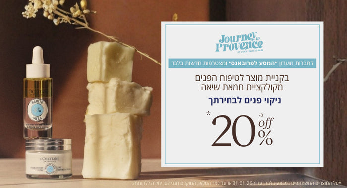 *לחברות מועדון "המסע לפרובאנס" ומצטרפות חדשות בלבד, על המוצרים המשתתפים במבצע בלבד, עד ה31.01.26 או עד גמר המלאי, המוקדם מבניהם, יחידה ללקוח\ה.