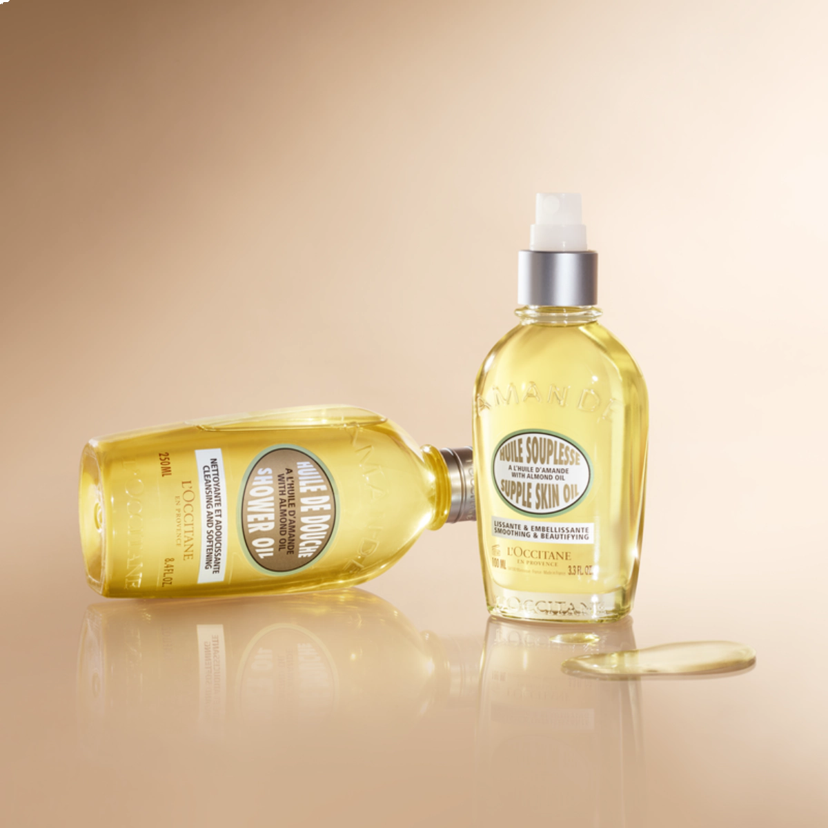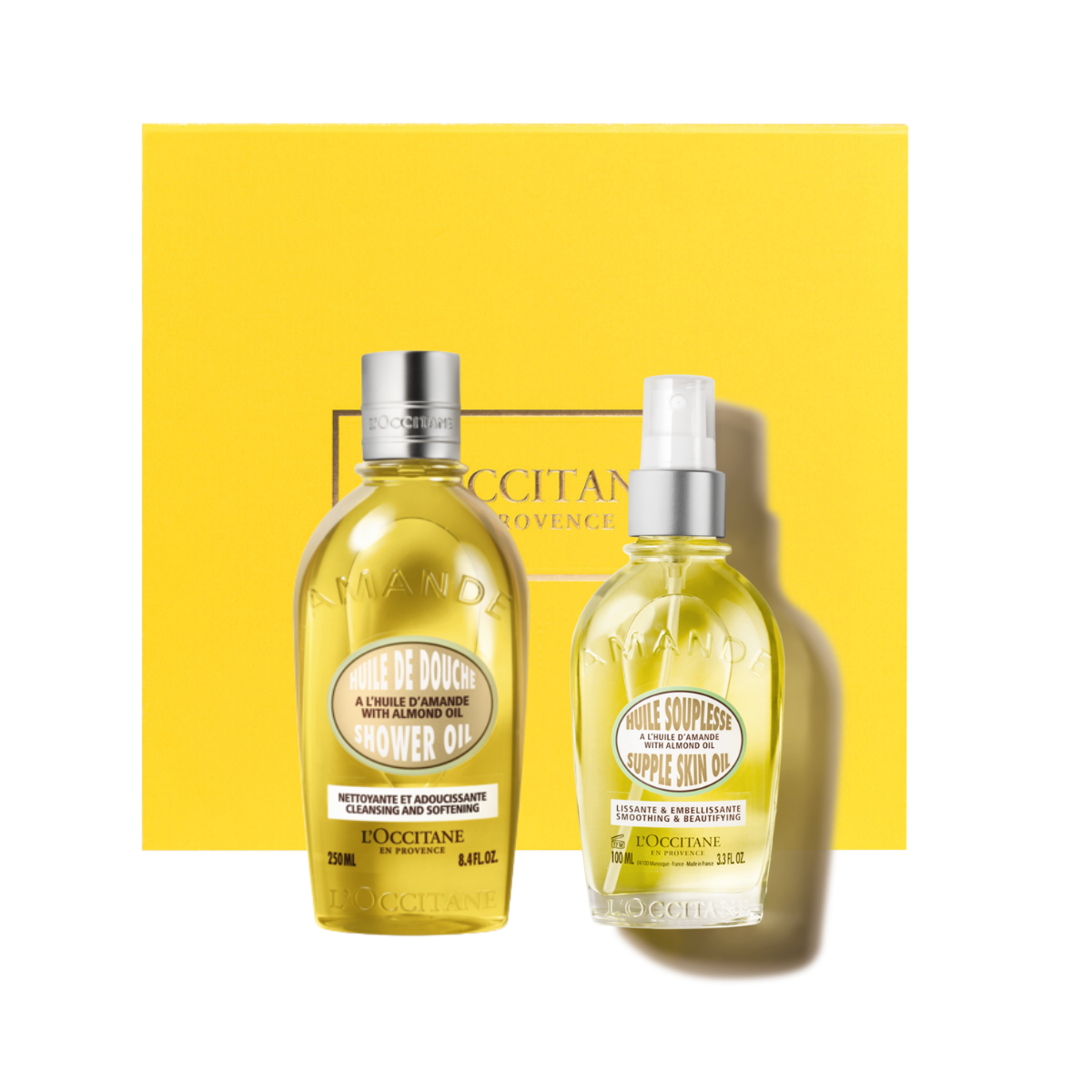 צמד מוצרים לטיפוח ורחצת הגוף מסדרת שקד האהובה של ל'אוקסיטן.