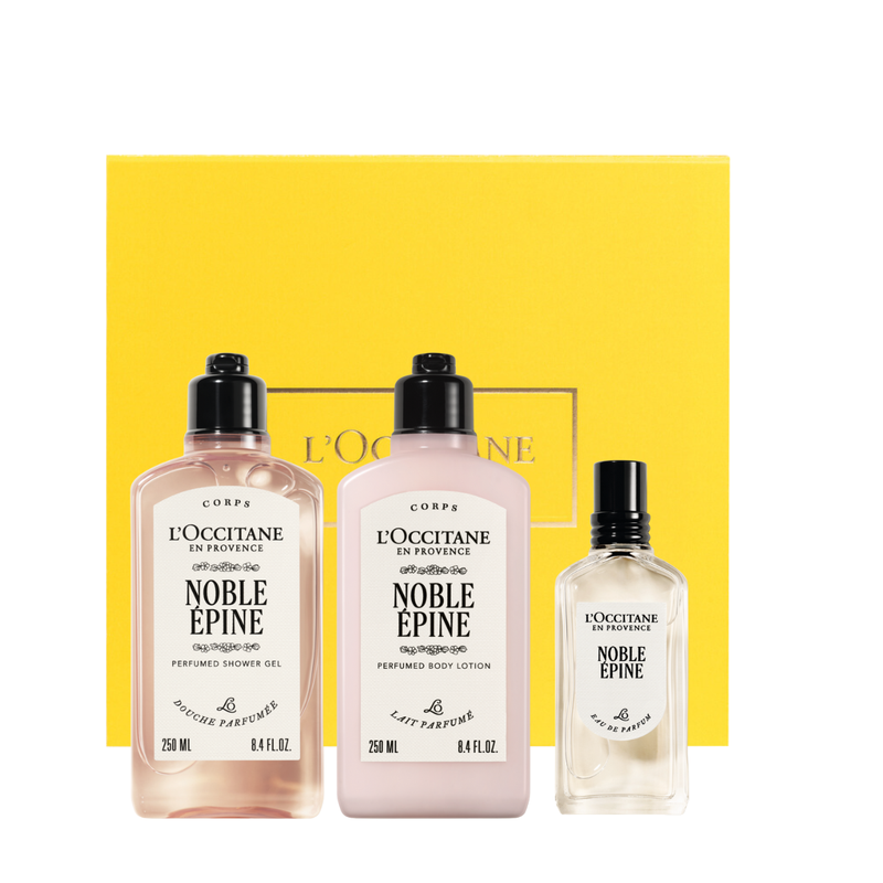 מארז מהודר של מוצרי Noble ?pine מקולקציית Forgotten Flowers שלנו. מוצרי טיפוח ובישום בעלי ניחוח רך ועדין המכיל תמצית פריחת עץ ה"מאי" (המכונה עץ הפיות) מדרום צרפת.