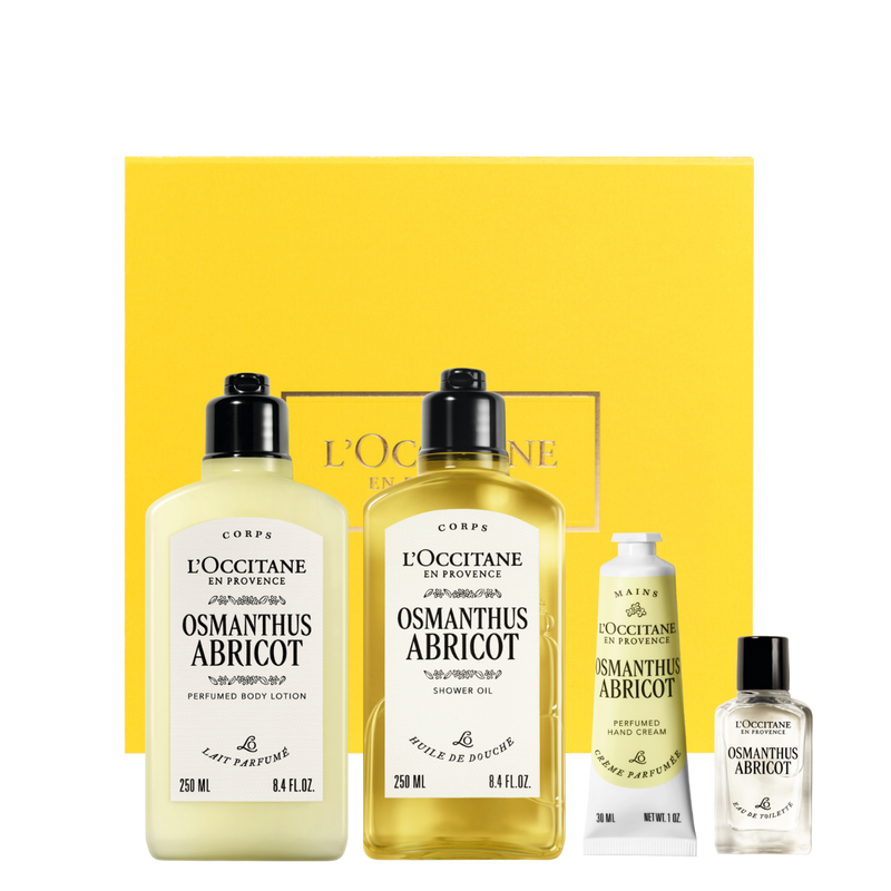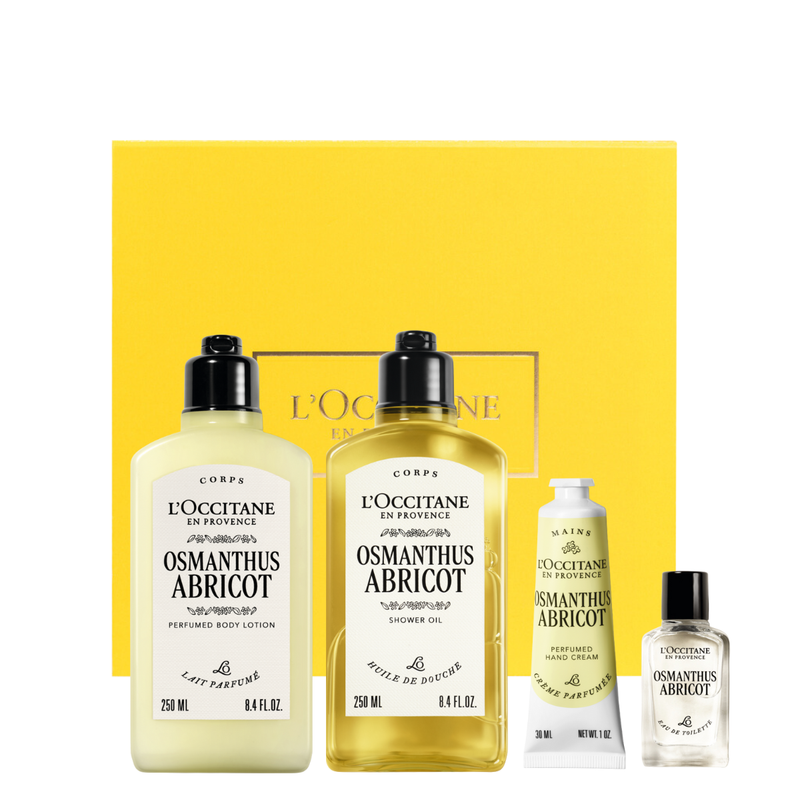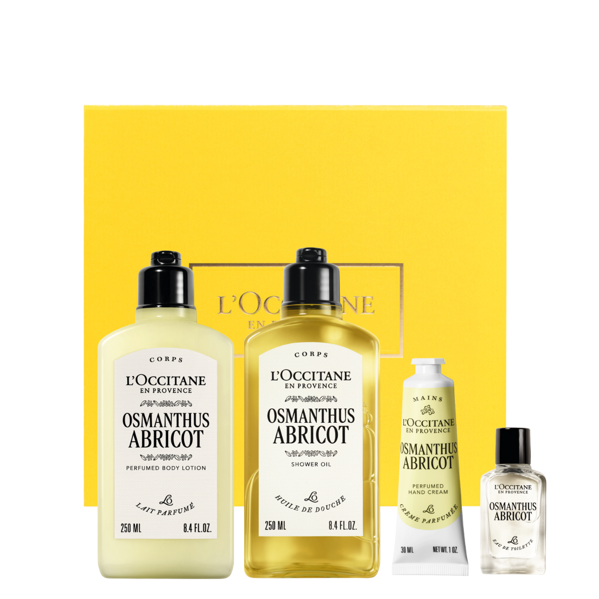 ל'אוקסיטן אן פרובאנס חושפת את ניחוחו הייחודי והמעודן של אוסמנטוס משמש (לשעבר אוסמנטוס) במארז מתנה יפהפה בעל רעננות ירוקה, אפקט קטיפתי של משמש ותווים עציים רכים וקרמיים