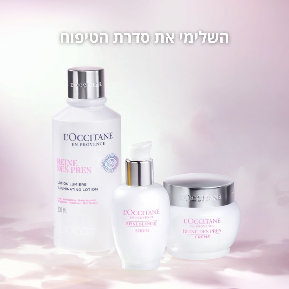 שגרת הטיפוח Reine Des Prés מועשרת בפרח העוקצנית, תות עץ לבן וחומצה סליצילית – הענקת זוהר מתחילה בשגרת טיפוח יומיומית ואיכותית. השילוב הזה נועד לאחד את גוון העור, להעניק לו מראה אחיד, ולהשיב לו את הברק והרעננות