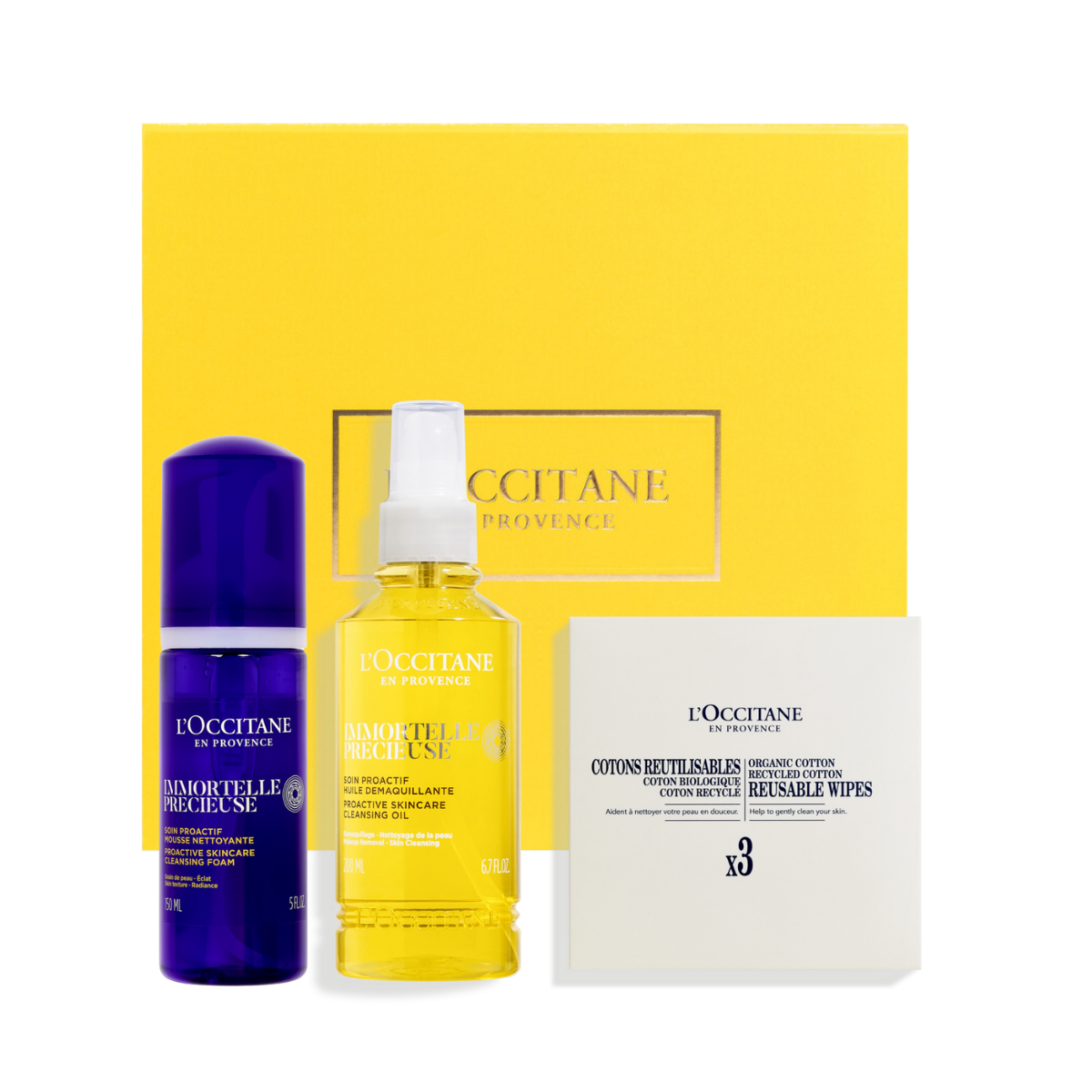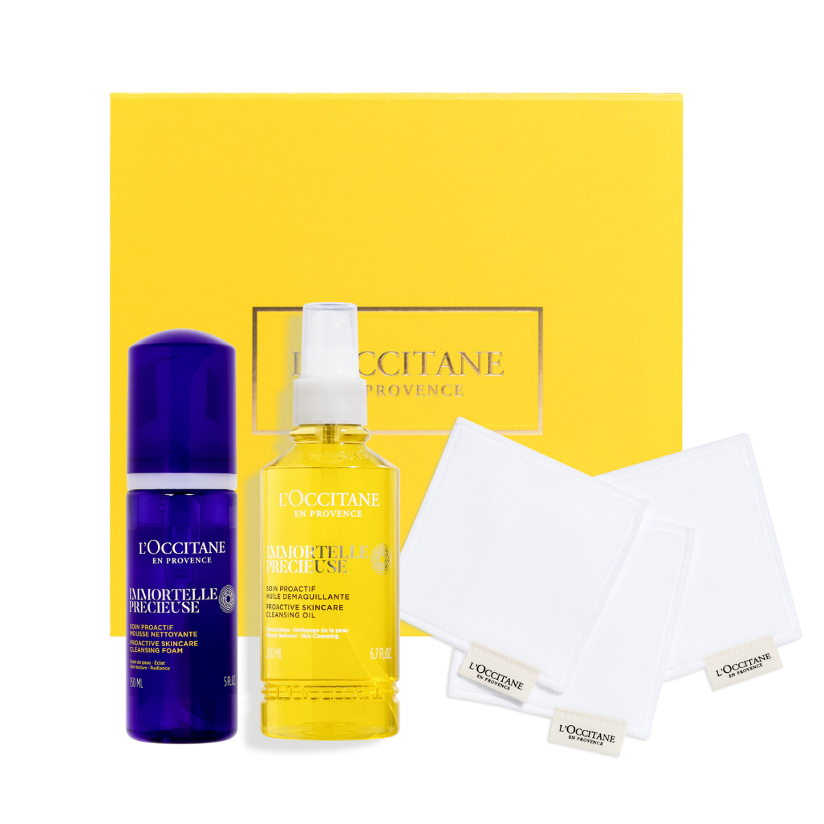 מארז מוצרים לניקוי פנים כפול מסדרת האימורטל, מועשרים בשמן אתרי אימורטל בעל סגולות האנטי אייג'ינג.