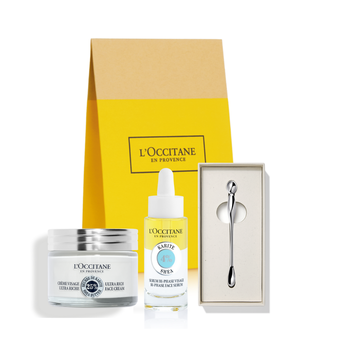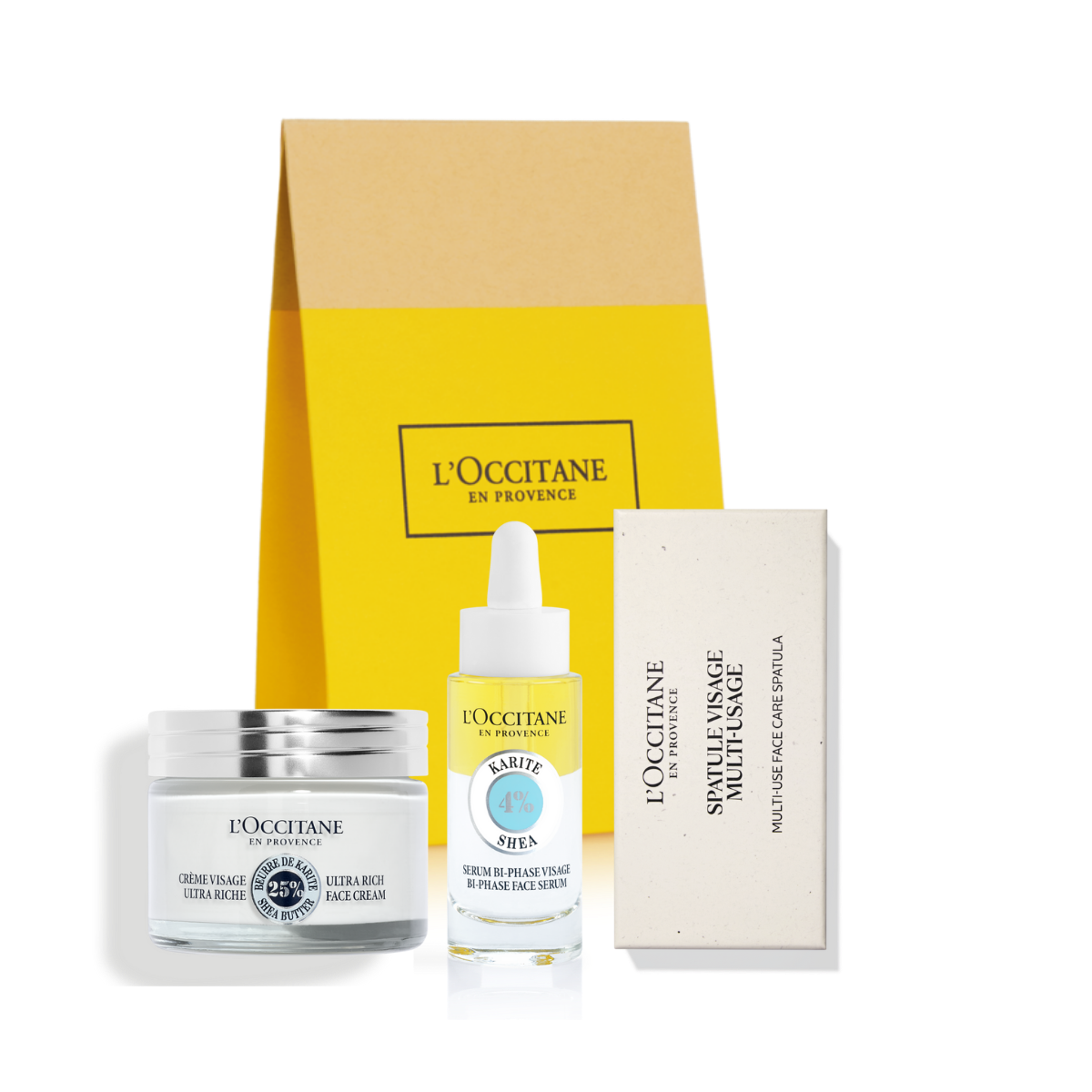 ערכה מושלמת המכילה מוצרים לטיפוח העור המועשרים בחמאת שיאה אורגנית עבור הזנה אינטנסיבית בלחות לעור יבש עד יבש מאוד.