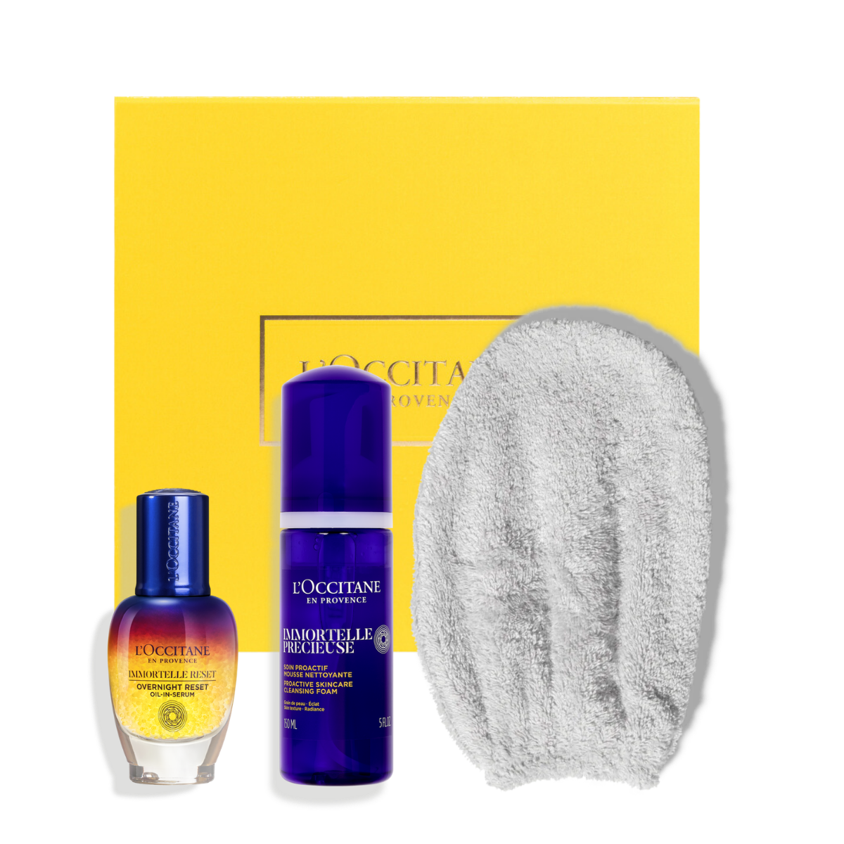 ערכה לניקוי וחידוש עור הפנים בלילה, באריזה מהודרת עם המוצרים האהובים מסדרת אימורטל פרשס.