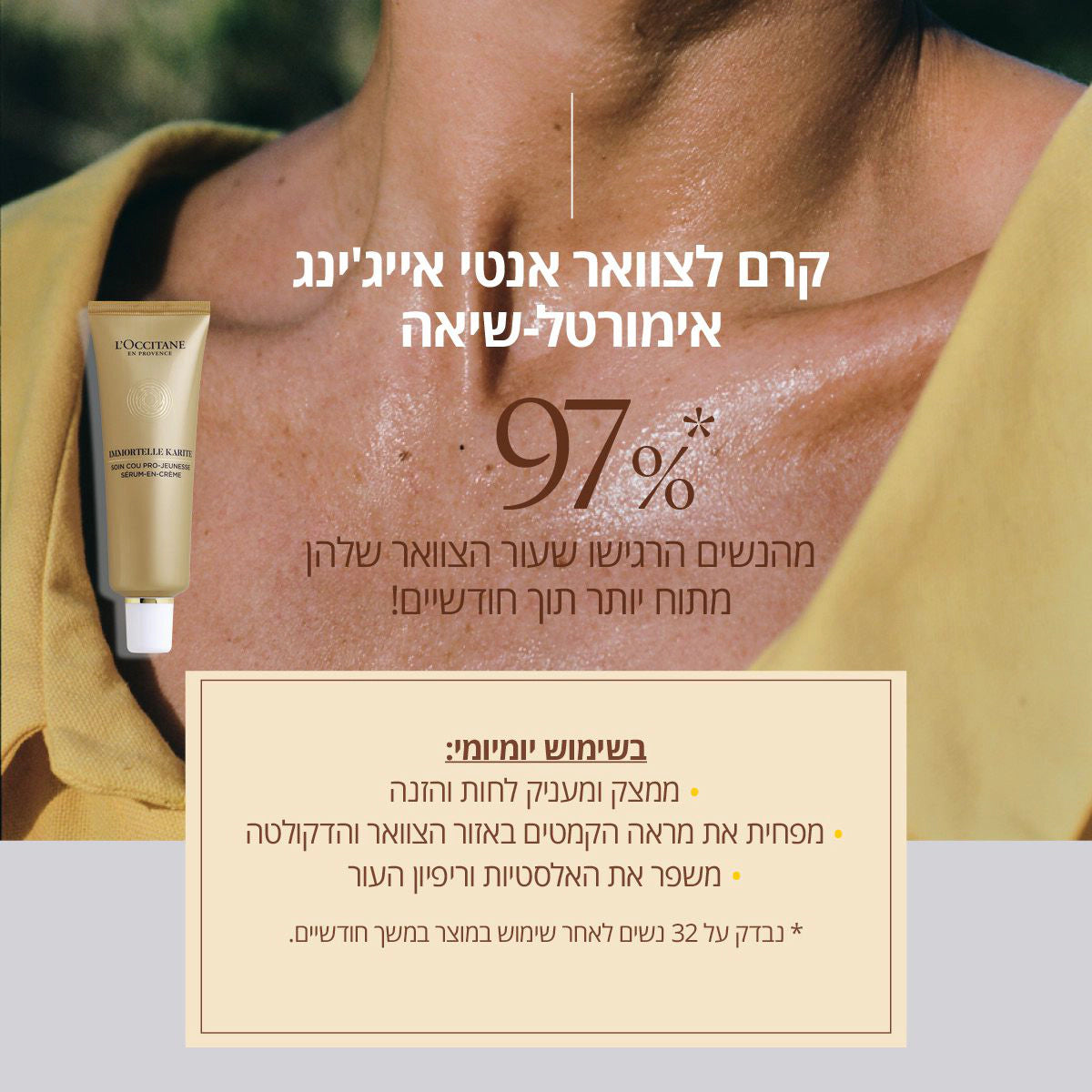 קרם אנטי-אייג'ינג לצוואר והדקולטה, המשלב חמאת שיאה, שמן אתרי אימורטל וחומצה היאלורונית, משפר את מראה העור, ומעניק לו מראה מוצק וחלק יותר.