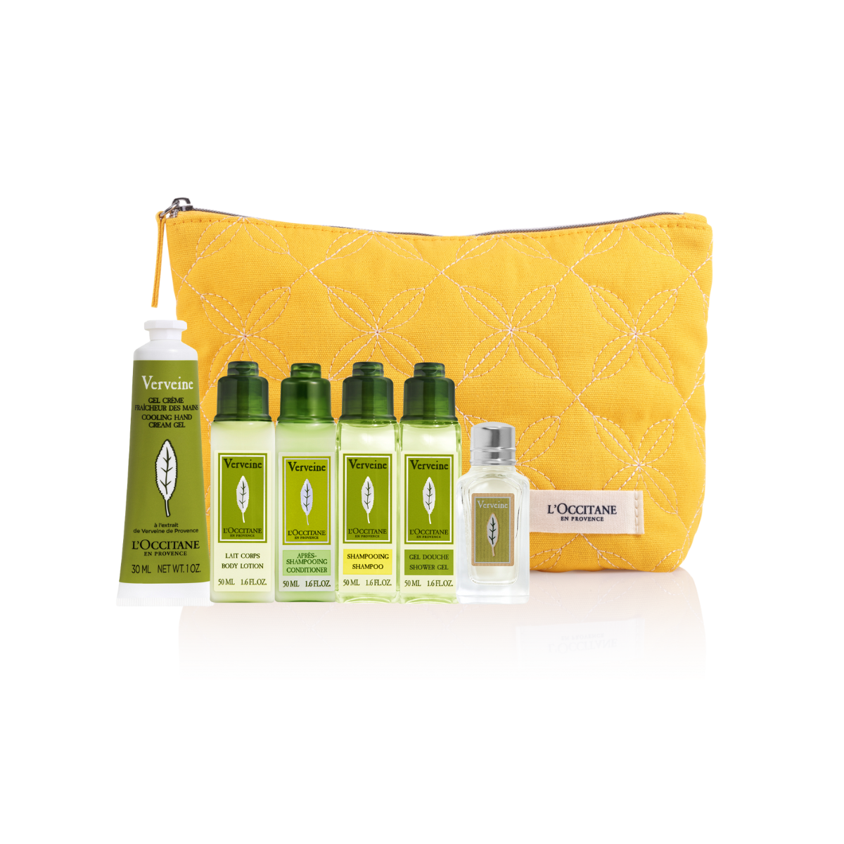 ערכה לטיפוח ובישום הגוף, הידיים והשיער מסדרת וורבנה המרעננת, המגיעה בתיק איפור מתוק שימושי לנסיעות.