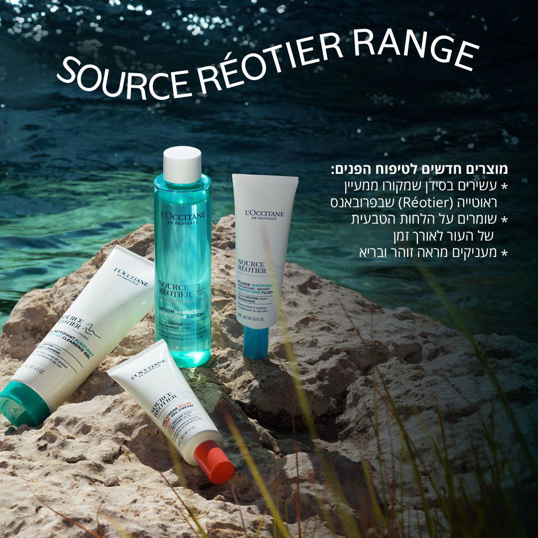 העניקי לעורך את האיזון המושלם בין רמת הלחות להפחתת הברק בעור עם מארז לטיפוח הפנים מסדרת Source Réotier (מעיין ראוטייה).