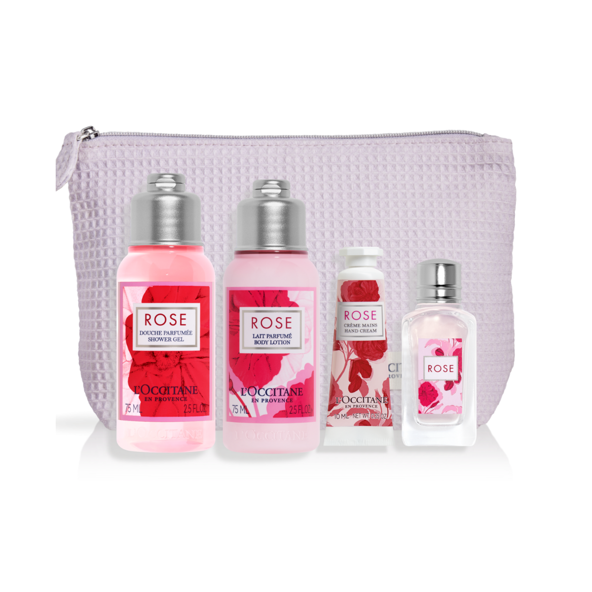 ערכת וורדים בתיק איפור צבעוני עם מוצרים לטיפוח הגוף והידיים בניחוח פרחוני ונשי בגודל נסיעה.