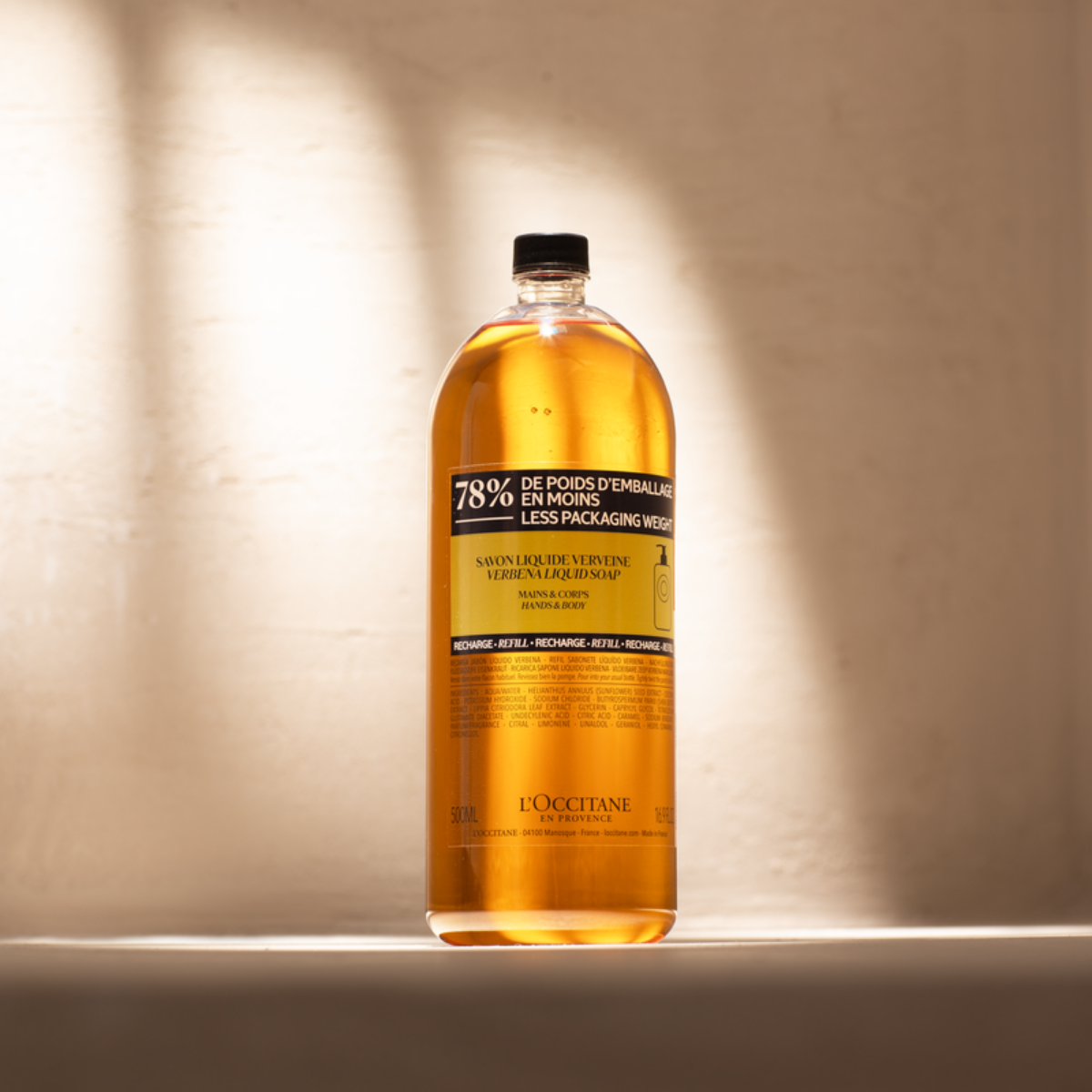 סבון נוזלי חמאת שיאה בניחוח ורבנה, באריזת מילוי חסכונית ואקולוגית , עשויה מ-100% פלסטיק ממוחזר.